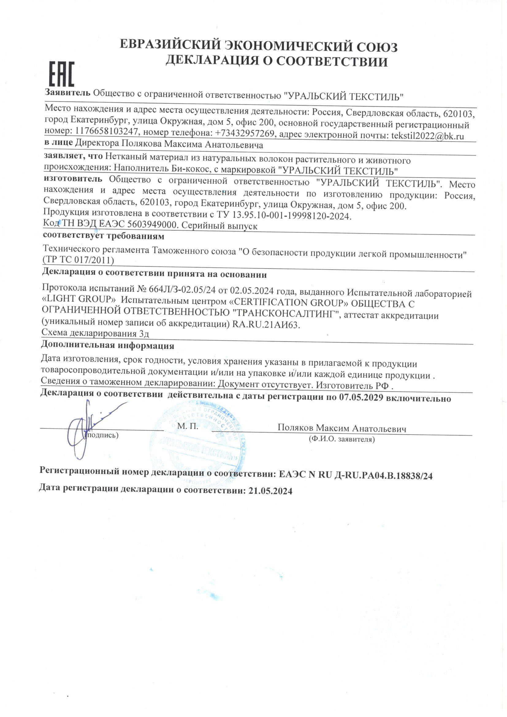 Декларация соответствия на наполнитель "Би-кокос" 408.2 Кб